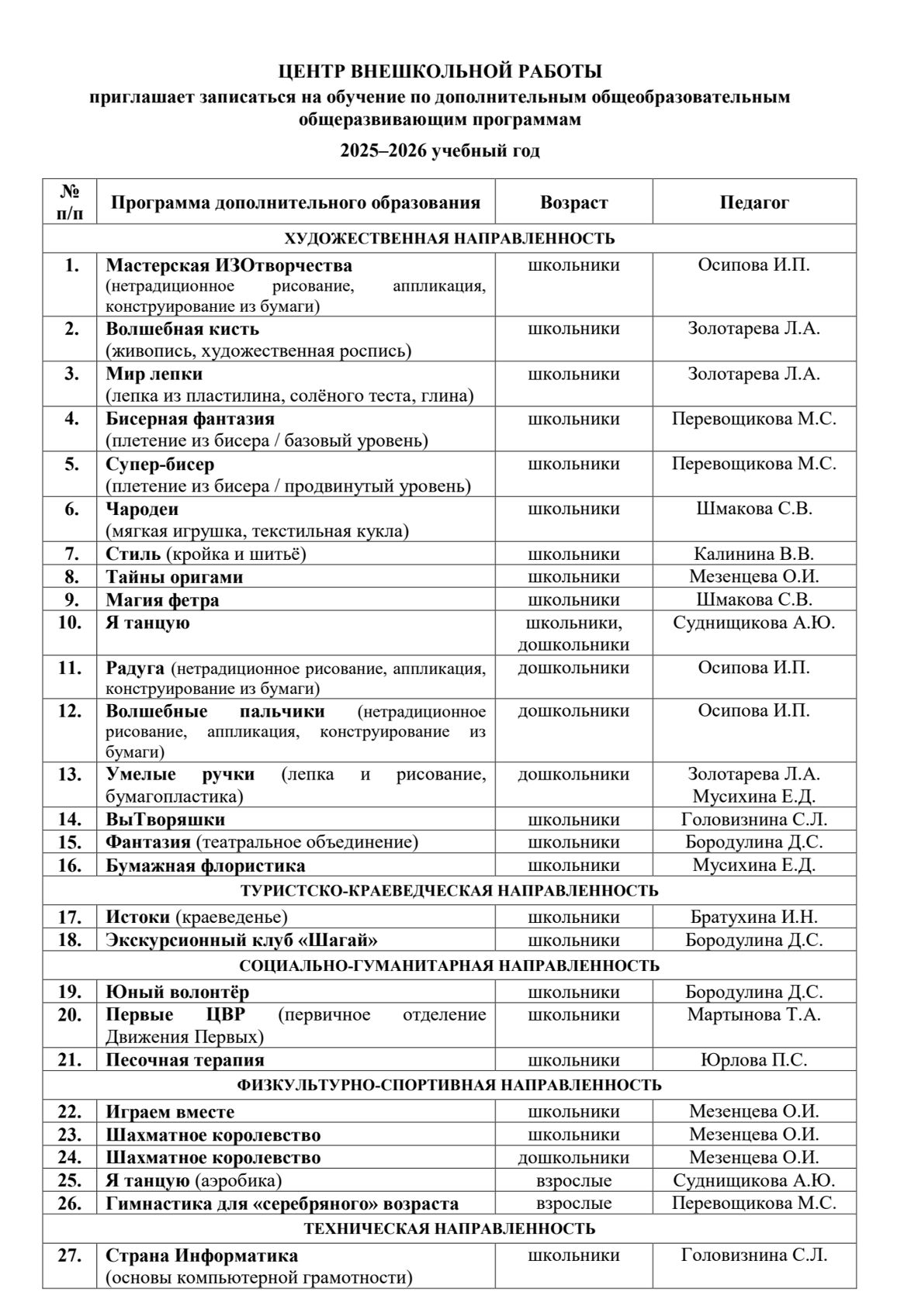На 01.09.2025 года функционирует 27 объединение. В МБУ ДО ЦВР пгт Уни Кировской области принимаются дети и подростки от 5 до 18 лет и старше 18 лет, проживающие в пгт Уни и Унинском муниципальном округе. Правила приема и перевода обучающихся Центра внешкольной работы